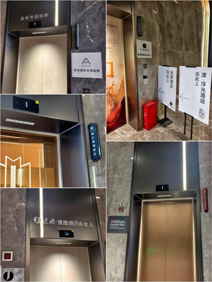 六家旅舍的前台一字排开,各自占据着大堂的一角。电梯间更为夸张,每一家旅舍都在电梯进口开辟各自水牌,辅导客东谈主应该乘坐哪部电梯抵达哪家旅舍。