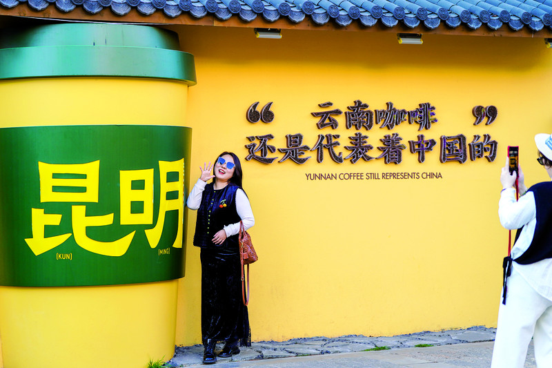 日前,旅客在位于翠湖左右的翠湖咖啡文化中心拍照打卡。