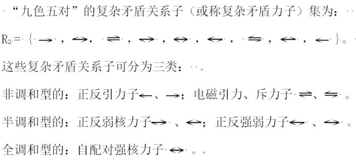 其中,非结伴型的引力、电磁力等“四色两对”的复杂矛盾力子在宏不雅层面进展为显在作用;而半结伴型的弱核力、强弱力以及全结伴型的强核力等“五色三对”的复杂矛盾力子则在微不雅层面进展为潜在作用。