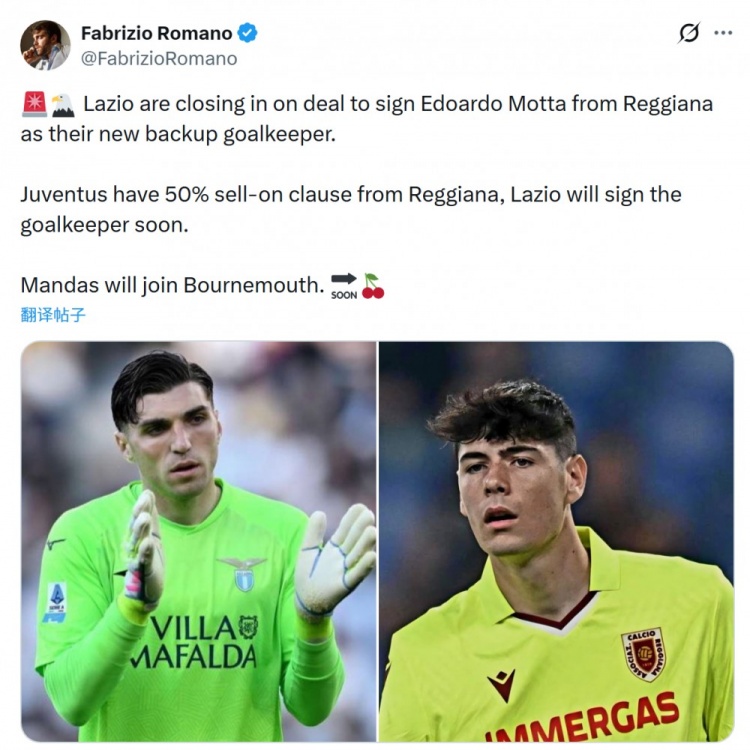 亚博体育 罗马诺:拉皆奥接近签下雷吉亚纳门将莫塔,尤文有50%转售分红