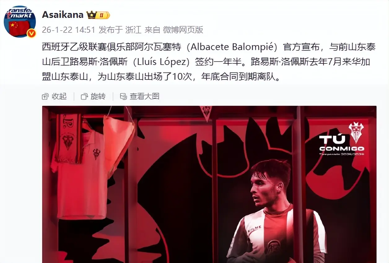 亚搏app官方网站 厚爱官宣! 山东泰山外助洛佩斯加盟西乙,俱乐部支付若干失约金?