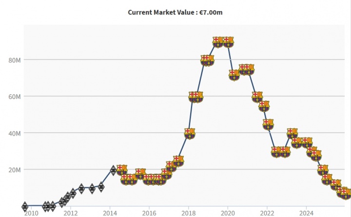 特尔施特根于2014年夏窗从门兴转会至巴萨,那时消耗巴萨1200万欧。2019年,亚搏特狮巅峰身价曾达到9000万欧,现在33岁的特狮身价仅700万欧。