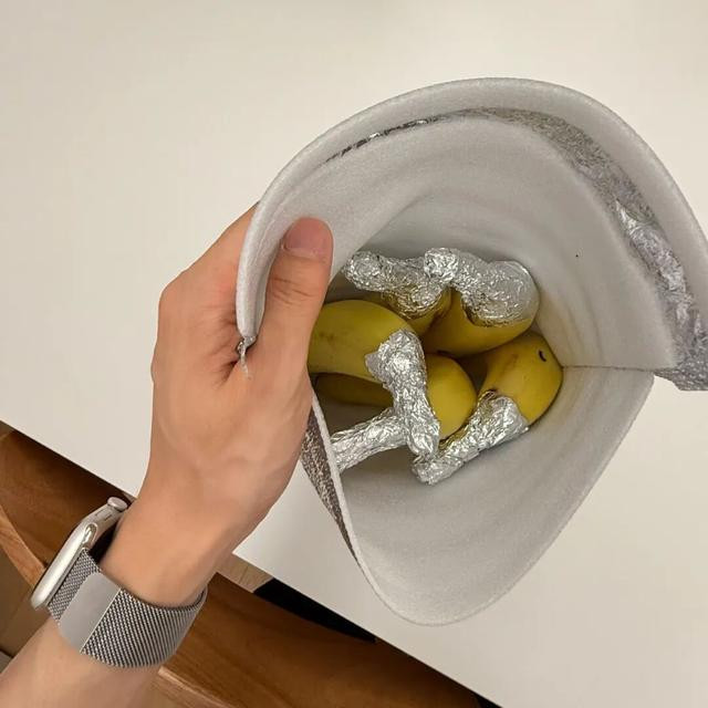 吃剩的香蕉根部用铝箔纸包死,装进保温袋塞雪柜,十几天齐不起黑斑。这东西遮光隔氧挡潮湿一把好手,保鲜成果凯旋甩凡俗塑料膜好几条街。