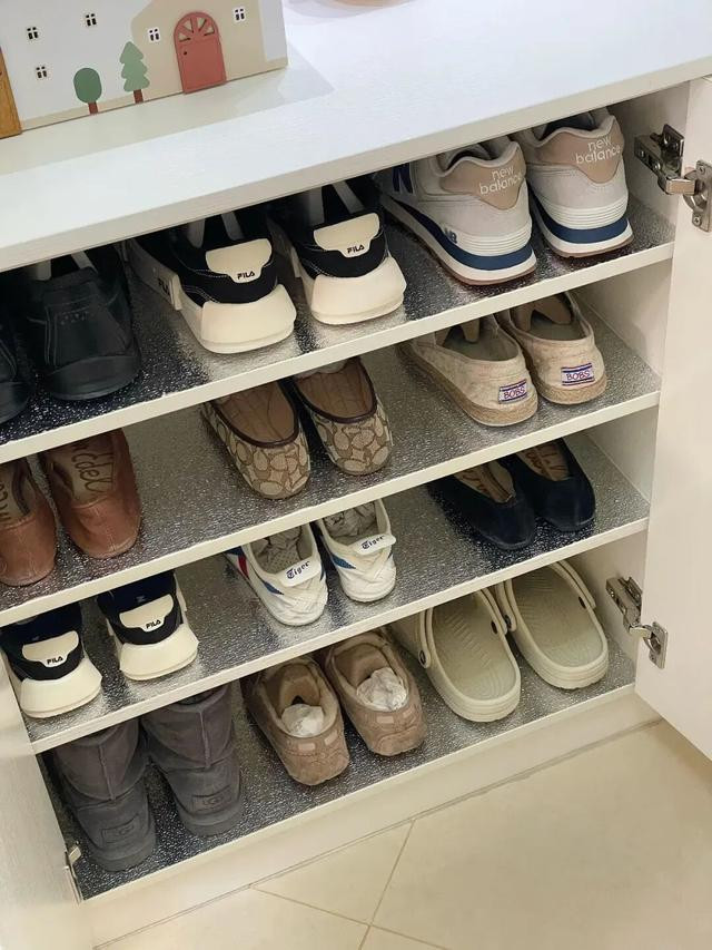 家里那些怕潮怕脏的木头柜子,用它来打底几乎是绝配。鞋柜每一层底板铺上铝箔纸,沾上泥点子油印子,抹布轻轻一行就干净,绝渗不到木头里去。