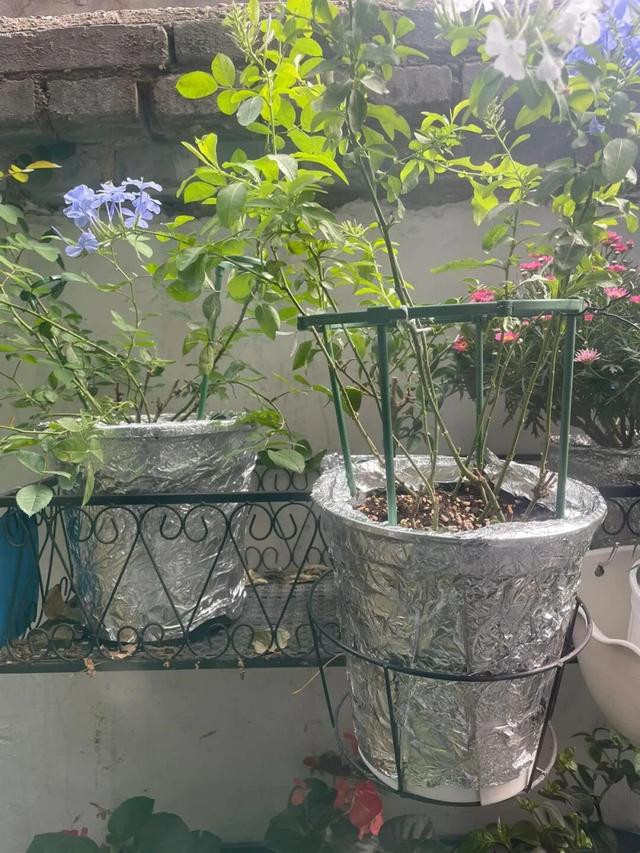 三伏天阳台上的花盆被太阳烤得烫手,花卉根一烂整盆全完蛋。拿铝箔纸把花盆外在裹个严密,太阳光全被这层银皮给弹且归了,盆土温度降下来,