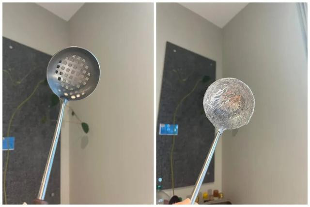 倒油倒酱油急需漏斗,满厨房找不到。一张铝箔纸卷成个漏斗形状,倒啥齐不带洒的。思喝口鸡汤莫得汤勺,轻视找个带眼的漏勺,外头裹上铝箔纸凯旋顶上,简直没家伙什,我方拿手持一个,思啥形状持啥形状,用完一扔不细密。