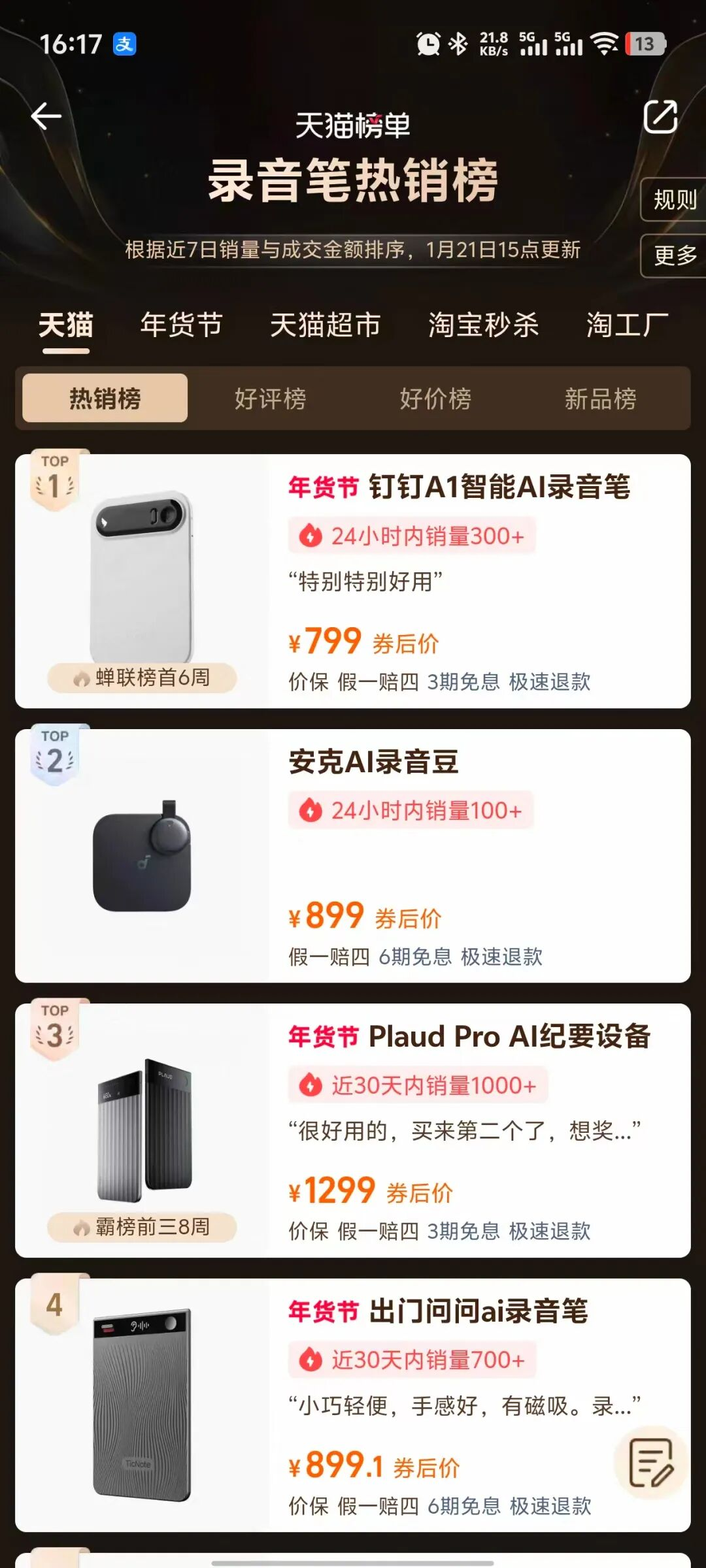 在天猫灌音笔热卖榜上,销量前三名是钉钉 A1、安克 AI 灌音豆和 Plaud Pro,其中钉钉 A1 当年 24 小时的销量数据是 300 多台。
