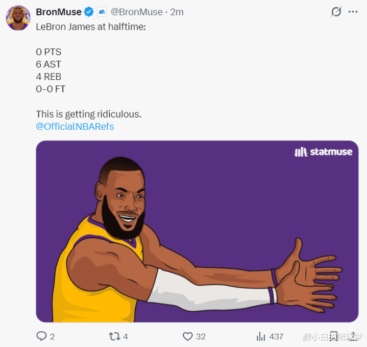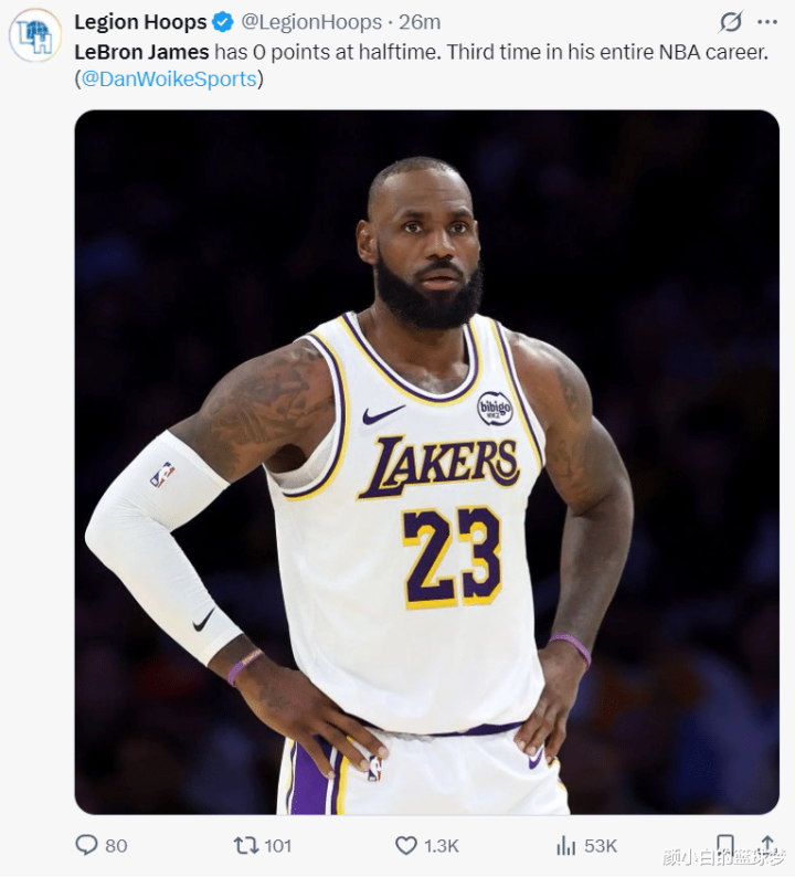 统统上半场詹姆斯出战了18分钟,5中0,三分1中0,拿到0分4篮板6助攻,屡次冲击篮下齐莫得赢得罚球,湖东谈主媒体:@NBA官方裁判写谈这险些太造作了。