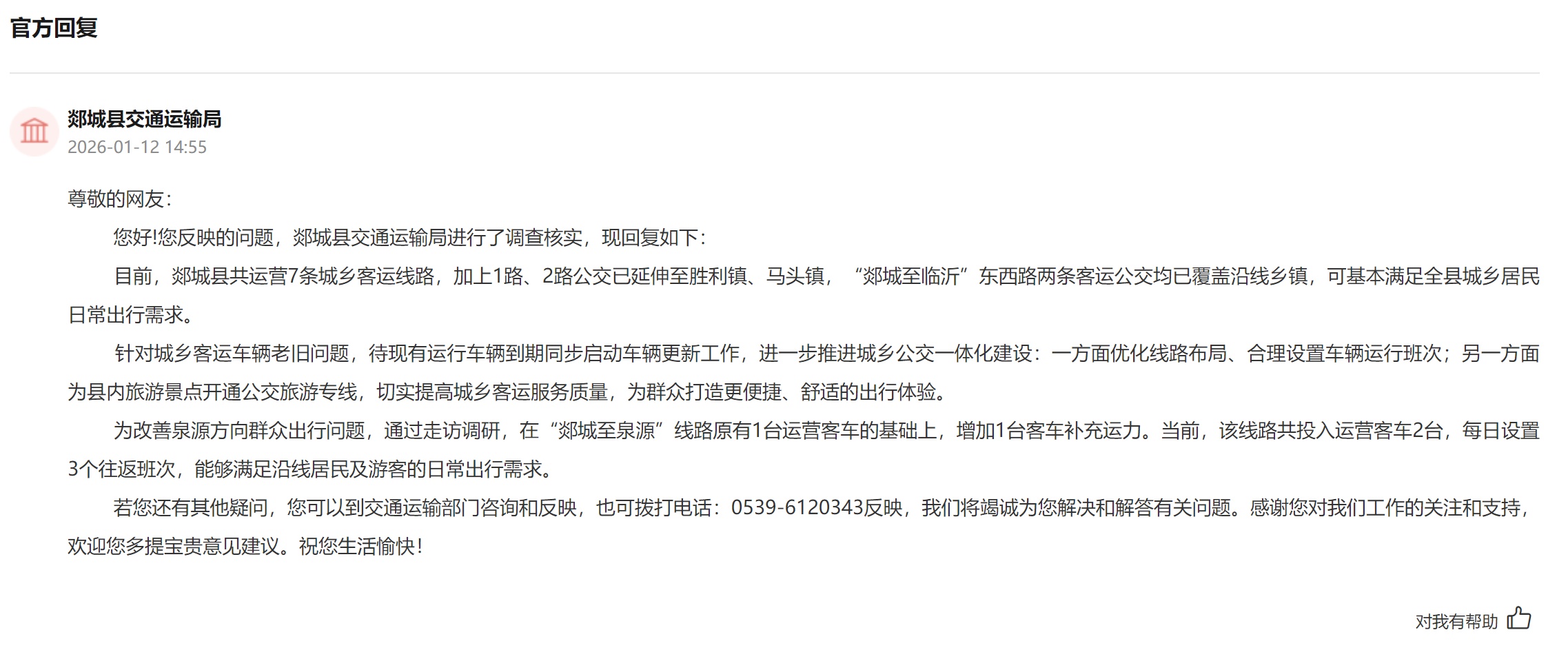 面对网友热心,郯城县交通运载局在回复中积极回复,并带来了系统性的“出行改善方针”。